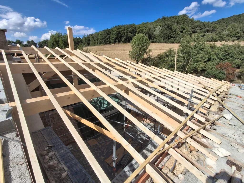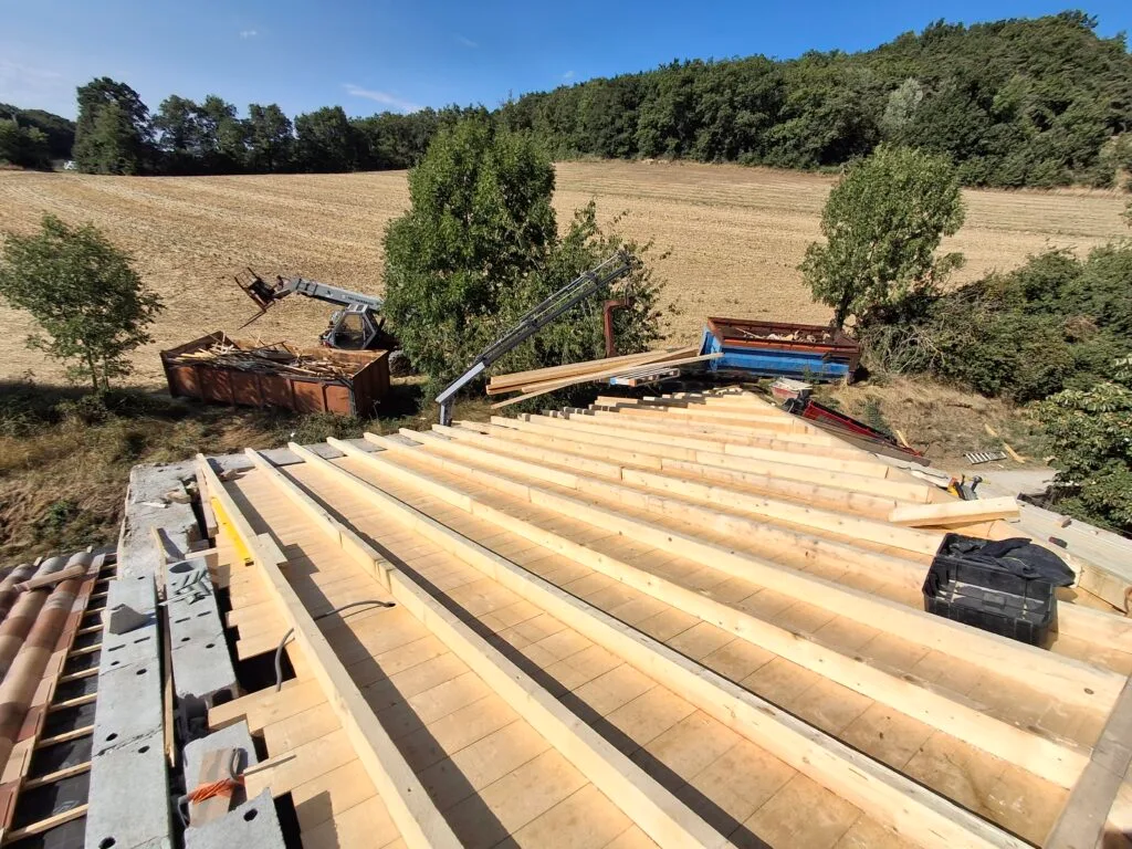 Ce chantier illustre notre expertise : la démolition de l’ancienne toiture et la reconstruction complète d’une charpente traditionnelle et de sa couverture.