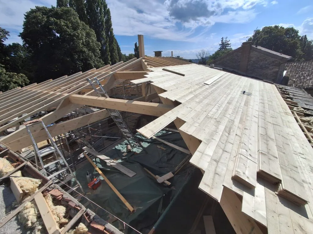 Après la charpente, nous avons réalisé la pose d’un voligeage complet douglas mi-bois raboté avant de mettre en place la nouvelle couverture.